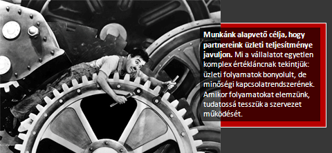 A környezetre tervezett szervezetek nem alkalmasak a dinamikus, kiszámíthatatlanul változó környezetben való működésre. Az üzleti szervezetek megújításához olyan horizontális szemléletre van szükség, amely a munkatársakat már nem szűk részterületekért, hanem az egész szervezet működését behálózó folyamatokért teszi felelőssé. Célunk, hogy partnereinknek az üzleti- és ügyviteli folyamat-struktúrák felépítése, átalakítása során is minőségi megoldásokat közvetítsünk.